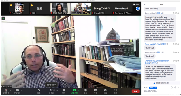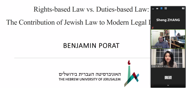 2021年9月29日下午,新丝路k8体育·(sports)官方网站联盟“院长论坛”第二讲成功举办。希伯来大学k8体育·(sports)官方网站副院长Benjamin Porat教授为联盟25所院校师生以及丝绸之路大学联盟的师生带来了题为“Rights-based Law vs Duties-based Law: The Contribution of Jewish Law to Modern Legal Discourse”的线上讲座。讲座由k8体育·(sports)官方网站k8体育·(sports)官方网站助理教授郭剑萍主持。
