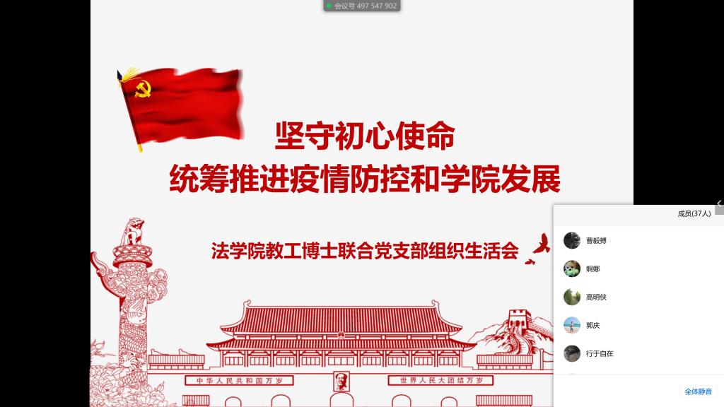 学生工作专职委员张乃钟通报了学院研究生工作。在学院疫情防控工作领导小组的领导下,k8体育·(sports)官方网站各研究生党支部充分发挥战斗堡垒作用,每日帮助落实学生健康日报。学院密切关注学生思想和身体状况,重点关注假期留校以及湖北籍的同学,切实抓好研究生涉外疫情防控工作。疫情防控期间,学院研究生在做好自身防护的同时,积极参与社区的疫情防控工作,服务家乡;k8体育·(sports)官方网站研究生会主动联合武汉大学k8体育·(sports)官方网站研究生会举办工作经验分享交流活动,积极开展线上“春之声”法律文化节,丰富同学课余生活。张乃钟老师表示,接下来要加强与研究生导师的交流,进一步做好学生就业精准指导工作。同时,按照学校要求,做好学生分批返校准备工作,构筑平安校园。