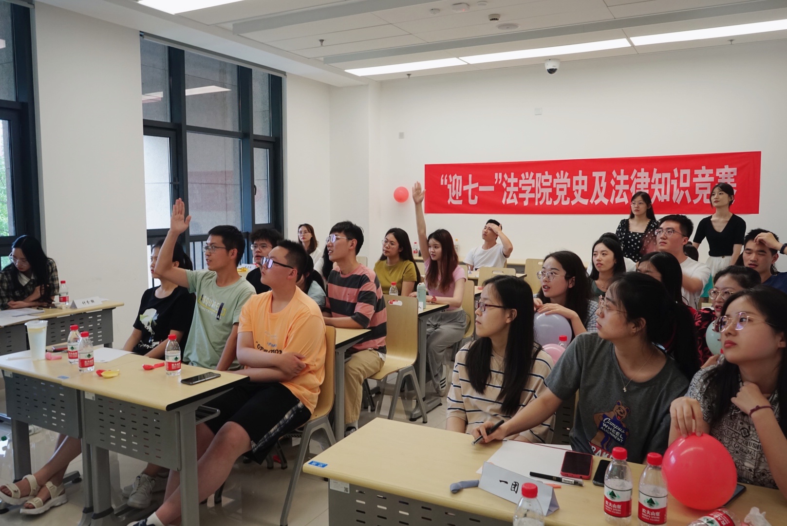 本次党史及法律知识竞赛共分为四个环节,分别为党史知识“猜猜猜”、党史判断“抢抢抢”、党史选择“辨辨辨”、党史事件“答答答”,各环节通过“你画我猜”、以吹气球或挤爆气球的速度决定答题顺序等形式,在增强竞赛趣味性的同时,把党的历史上的关键节点、光辉画面、红歌传承等有机结合在一起,引导同学们在轻松愉快的氛围中深化理论学习,铭记党的光辉历史。本次竞赛以团队为单位参赛,共有九支队伍参加,参赛选手来自法学、人居等多个学院不同年级的研究生。经过激烈的角逐,最终有四支队伍在四轮比赛中胜出,分别获得一、二、三等奖。