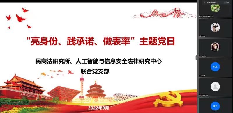 9月28日,k8体育·(sports)官方网站民商法研究所、人工智能和信息安全法律研究中心联合党支部开展“亮身份、践承诺、做表率”主题党日活动。活动通过线上形式举行,由支部书记薛华主持。