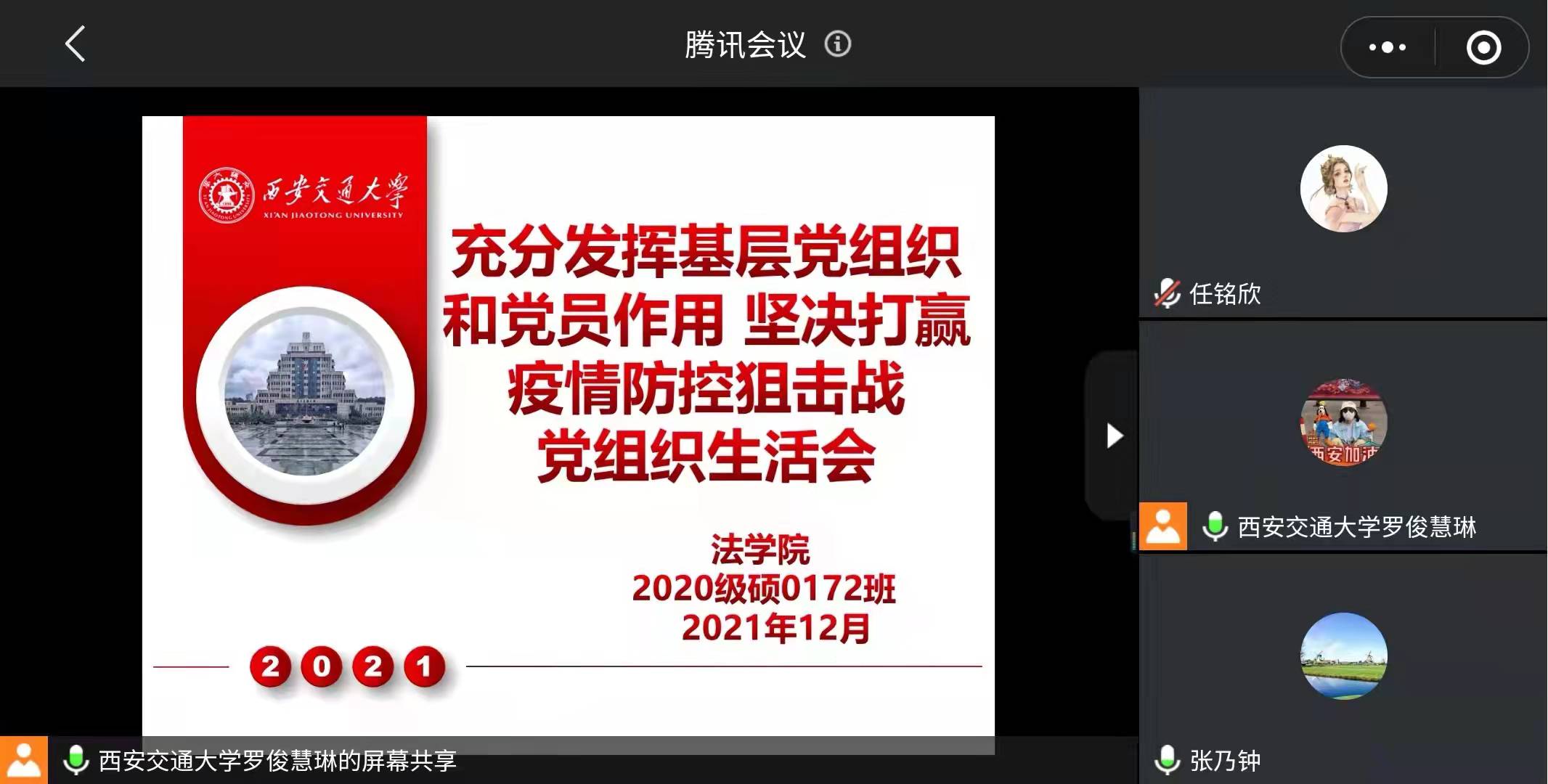 2021年12月30日晚,k8体育·(sports)官方网站硕0172党支部在线上召开了以“充分发挥基层党组织和党员作用 坚决打赢疫情防控狙击战”为主题的党组织生活会。会议由硕0172党支部书记罗俊慧琳主持,k8体育·(sports)官方网站党总支委员张乃钟老师出席,支部全体党员以线上方式参加了本次会议。