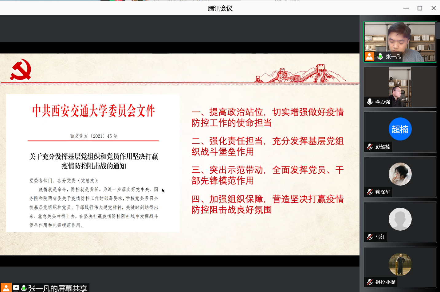 会议第一项,党支部书记张一凡带领支部成员学习了校党委“关于充分发挥基层党组织和党员作用坚决打赢疫情防控阻击战的通知”,对支部成员提出了四点要求,一要提高政治站位,切实增强做好疫情防控工作的使命担当,二要强化责任担当,充分发挥基层党组织战斗堡垒作用,三要突出示范带动,全面发挥党员、干部先锋模范作用,四要加强组织保障,营造坚决打赢疫情防控阻击战良好氛围。