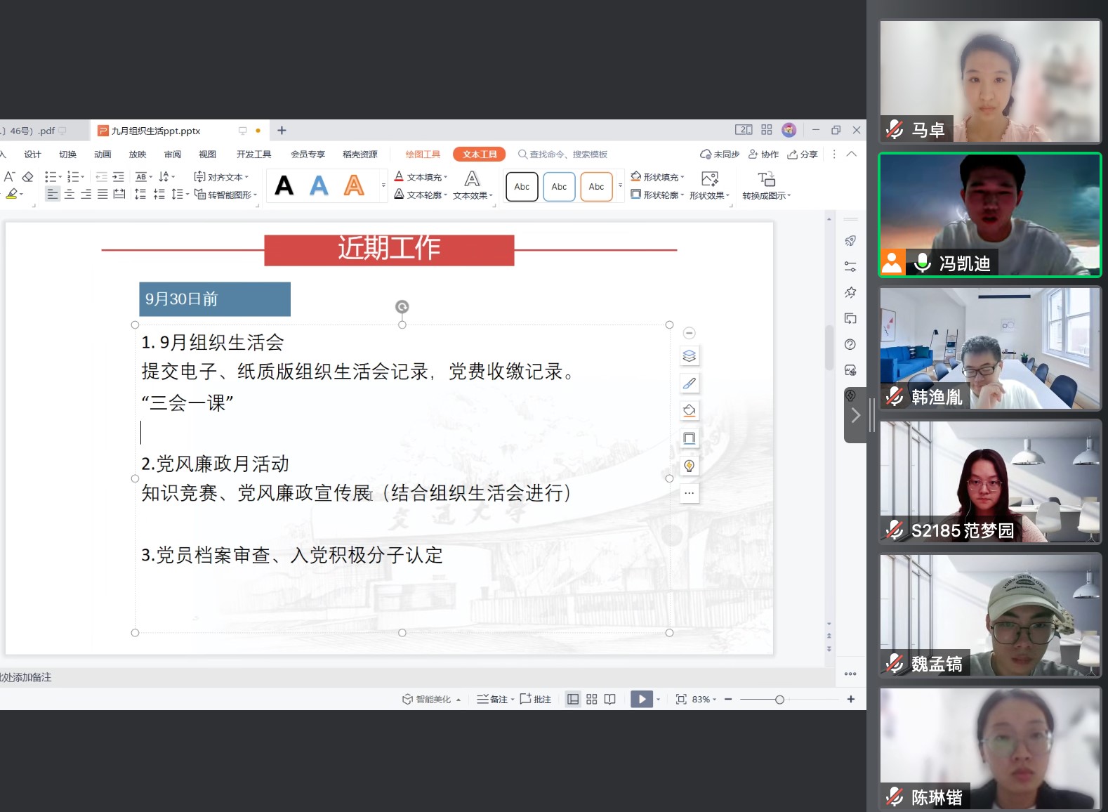 2022年9月27日晚,k8体育·(sports)官方网站硕2185党支部举行了九月组织生活会,也是本支部的第一次会议。根据疫情防控相关要求,本次组织生活会采用线上的方式进行。本次会议由党支部书记冯凯迪主持,党员及入党积极分子共15人参加会议。