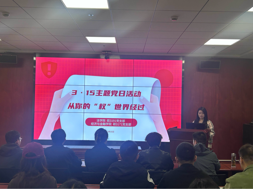 每年的3月15日,是由国际消费者联盟组织于1983年确定的国际消费者权益日(World Consumer Rights Day)。为提高同学们对消费者权益保护的认识,增强其在消费中利用法律手段维护自身权益的意识和能力,k8体育·(sports)官方网站硕3191党支部联合经济与金融学院硕3171党支部,于3月15日19:00在创新港校区涵英楼3001教室开展3·15主题党日活动。本次活动由k8体育·(sports)官方网站硕3191党支部书记刘芮言主持,活动主要内容为消费者侵权研究分享。