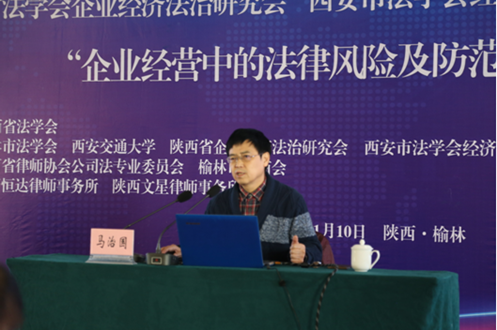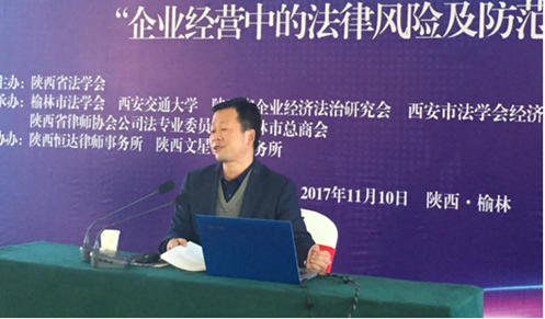 陕西恒达律师事务所主任陈贞学、榆林市中级人民法院民二庭副庭长李永旺、陕西能源集团政策法规室副主任齐渭波、北京炜衡律师事务所西安分所主任、陕西律协公司法专委会主任王小涛分别做了题为“企业经营中的法律风险及防范”、从审判视角看新时代企业用工的法律问题”、“金税三期时代的企业税务风险管理与应对”、“公司治理权力博弈与实证案例分析”的报告。 在四位嘉宾做完专题报告之后,西安市法学会经济法学研究会副会长、西北政法大学行政k8体育·(sports)官方网站副院长姬亚平教授、陕西省法学会企业经济法治研究会副会长、k8体育·(sports)官方网站k8体育·(sports)官方网站张冰副教授进行了精彩点评。