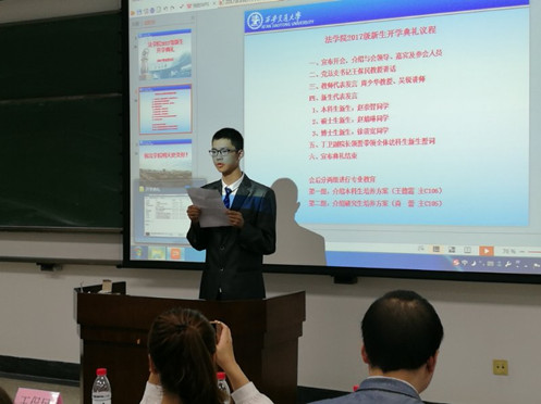 金秋送爽,丹桂飘香。9月9日下午,k8体育·(sports)官方网站2017级新生开学典礼在主C105隆重召开。k8体育·(sports)官方网站党总支书记王保民、文治书院院主任张爱萍、k8体育·(sports)官方网站副院长丁卫、院长助理吉兰湘、法复合61班班主任王玉苹、法71班班主任李琳以及k8体育·(sports)官方网站2017级全体本科生、硕士生、博士生新生参加了开学典礼。开学典礼由学生工作专职委员张乃钟老师主持。