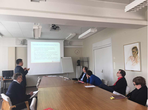 2017年4月20日,我院青年教师杜军强博士应赫尔辛基大学k8体育·(sports)官方网站及中国法与中国法文化中心邀请,在赫尔辛基大学k8体育·(sports)官方网站举办题为“传统中国的法律推理及其对当代中国的影响”的学术讲座。讲座在赫尔辛基大学k8体育·(sports)官方网站楼545会议室举行,由赫尔辛基大学k8体育·(sports)官方网站院长凯莫·诺提欧(Kimmo Nuotio)教授主持,多名学者及学生参加。