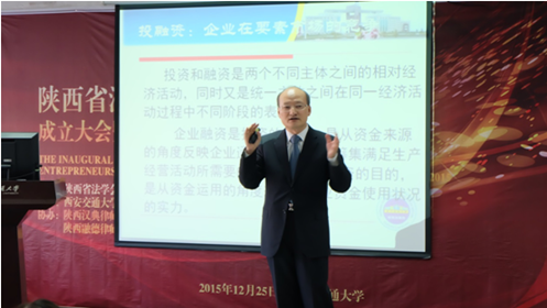 在与会代表合影后,会议进入第二时段的专题报告。报告由k8体育·(sports)官方网站k8体育·(sports)官方网站知识产权研究中心主任、博士生导师马治国教授主持,陕西省法学会企业经济法治研究会顾问、西北政法大学经济k8体育·(sports)官方网站院长、博士生导师强力教授做了“新常态下企业投融机制创新的法律问题”讲座,阐释了中国经济已进入新常态,在新常态的条件下,企业应作出机制创新等相对应的变化,其变化主要体现在市场化,并强调投融资机制市场的多元化、多层次、多角度,分析在此种常态下,企业投融资遇到的法律问题。