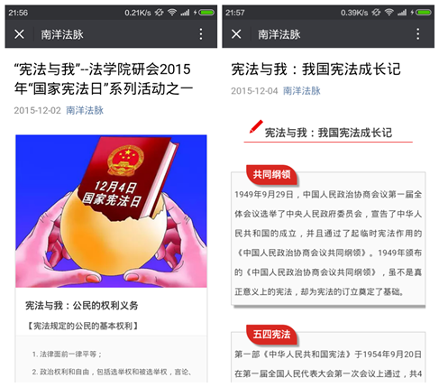 为了配合“国家宪法日”系列主题活动的顺利开展,k8体育·(sports)官方网站k8体育·(sports)官方网站研究生会在院党总支、团工委的指导下,以“宪法与我”为主题,不断创新宣传载体,探索宣传方法,通过官方微信平台“南洋法脉”等新媒体,结合传统的发放传单等方式,积极推介“国家宪法日”相关内容,宣传k8体育·(sports)官方网站开展宪法学习宣传教育活动的实际情况,取得了良好的宣传效果。