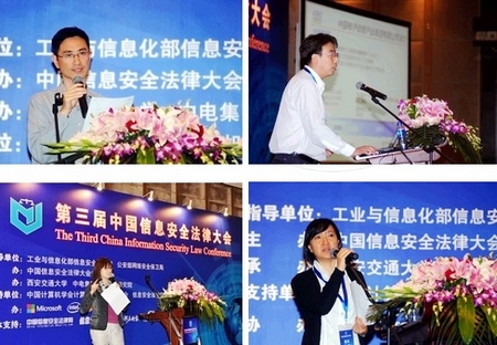 “云计算安全政策与法律论坛”由微软公司可信赖计算部总经理陈静主持,专家学者围绕云计算背景下的个人信息保护、云安全政策与标准、云取证、云环境下的个人数据跨境监管等问题进行了精彩的报告和研讨。北京邮电大学国际学院院长李欲晓对论坛进行点评。“关键基础设施保护与太空信息安全法律问题论坛”由黑龙江大学马海群教授主持,专家学者围绕信息安全等级保护制度、政府网络安全管理制度、IT供应链安全、太空信息安全、网络战等法律问题等进行报告和研讨。英特尔公司技术与标准政策总监张华燕对本论坛进行点评。“信息安全立法中的热点问题论坛”由北京大学周庆山教授主持,专家学者围绕物联网安全、数据存留、安全软件开源等法律问题进行了报告和研讨。奇虎360公司副总裁石晓虹对本论坛进行点评。“移动互联网时代隐私保护法律问题论坛”由北京邮电大学李欲晓教授主持,专家学者围绕搜索引擎业、智能终端安全、隐私保护等法律问题进行了报告和研讨,重庆大学齐爱民教授对本论坛的学术演讲进行点评。