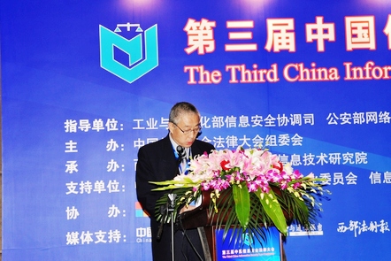 沈昌祥院士在会上讲话。他指出,信息是社会发展的重要战略资源,信息安全法制体系在国家信息安全保障体系中居于最高层级、具有基础性作用,在当前形势下,要加快信息安全立法、建立信息安全法制体系。工信部信息安全协调司胡啸处长、公安部网络安全保卫局李菁菁处长分别代表国家有关部门就网络与信息安全形势和立法执法问题作了重要讲话。