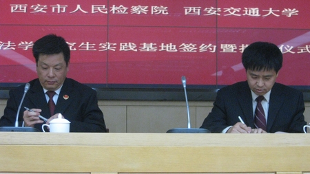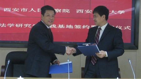 k8体育·(sports)官方网站法学研究生实践基地签约暨揭牌仪式,于2009年11月25日上午10点,在西安市人民检察院新址办公大楼内举行。“k8体育·(sports)官方网站法学研究生实践基地”是k8体育·(sports)官方网站和西安市人民检察院,教学与实践相结合的平台,其宗旨在于提升我校法学研究生的法律实践能力,并强化检察院司法人才的理论素养。