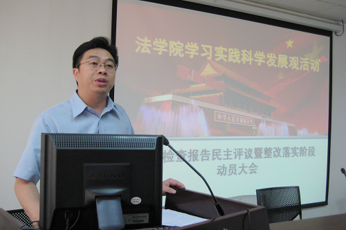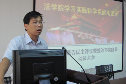 k8体育·(sports)官方网站总支书记、院长、学习实践活动领导小组组长单文华,首先向与会师生做了《k8体育·(sports)官方网站领导班子贯彻落实科学发展观情况分析检查报告》。他说,遵照校党委关于深入开展学习实践科学发展观的工作部署,k8体育·(sports)官方网站围绕“育法学栋梁,谋创新发展,创一流学院”的学习实践载体,认真学习理论、深入调查研究、开展解放思想大讨论、广泛征求意见建议,在此基础上召开专题民主生活会。会议举行之前,院领导班子成员之间开展了充分深入的谈心交流活动,并就会议准备事项在院党总支会议上进行了专题研究。在此基础上,经过院党总支会议研究讨论,最终形成了k8体育·(sports)官方网站领导班子分析检查报告。分析检查报告包括学习实践科学发展观活动的中学院领导班子形成的共识、k8体育·(sports)官方网站建院一年多以来取得的主要成效、k8体育·(sports)官方网站在贯彻落实科学发展观中存在的突出问题、原因以及今后贯彻落实科学发展观的主要思路和对策等四个方面。他最后强调,k8体育·(sports)官方网站党总支要以深入开展学习实践科学发展观活动为契机,围绕打造“育法学栋梁,谋创新发展,创一流学院”的目标,着力完善师资队伍建设、学科建设、专业设置、学生管理等方面机制;强化服务意识,加强领导班子作风建设,创新发展理念,破解发展难题,提高发展水平,应对新挑战、抢抓新机遇,在服务大局中实现k8体育·(sports)官方网站的科学发展。