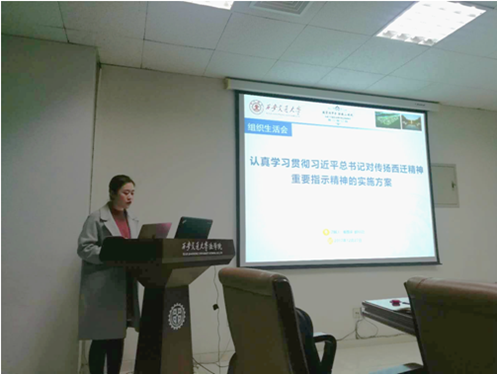 畅雅琛首先介绍了《认真学习贯彻习近平总书记对传扬西迁精神重要指示精神的实施方案》、《给总书记的信》等内容,学习了陕西省委主要领导对学习贯彻习近平总书记重要指示提出的相关要求,并通过相关视频,向同学们展示了“胸怀大局、无私奉献、弘扬传统、艰苦创业”的西迁精神,体会了我校坚持“扎根西部、服务国家、世界一流”的办学定位,看到了以习近平同志为核心的党中央对西迁老教授的关怀、对“西迁精神”的肯定、对k8体育·(sports)官方网站的期望。