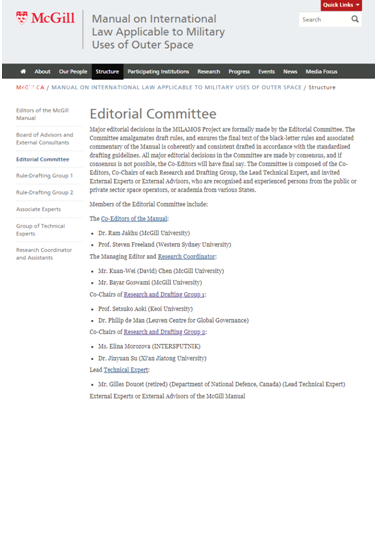 《适用于外空军事利用的国际法手册》项目编委会由9人组成,负责手册条款的协调统一等事务,是项目的决策机构。苏金远教授在项目第一阶段工作中担任外空法小组核心成员;在项目第二阶段中将担任编委,同时担任第二起草小组的联合主席。