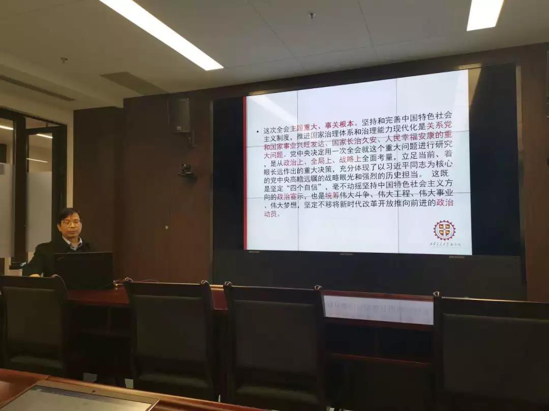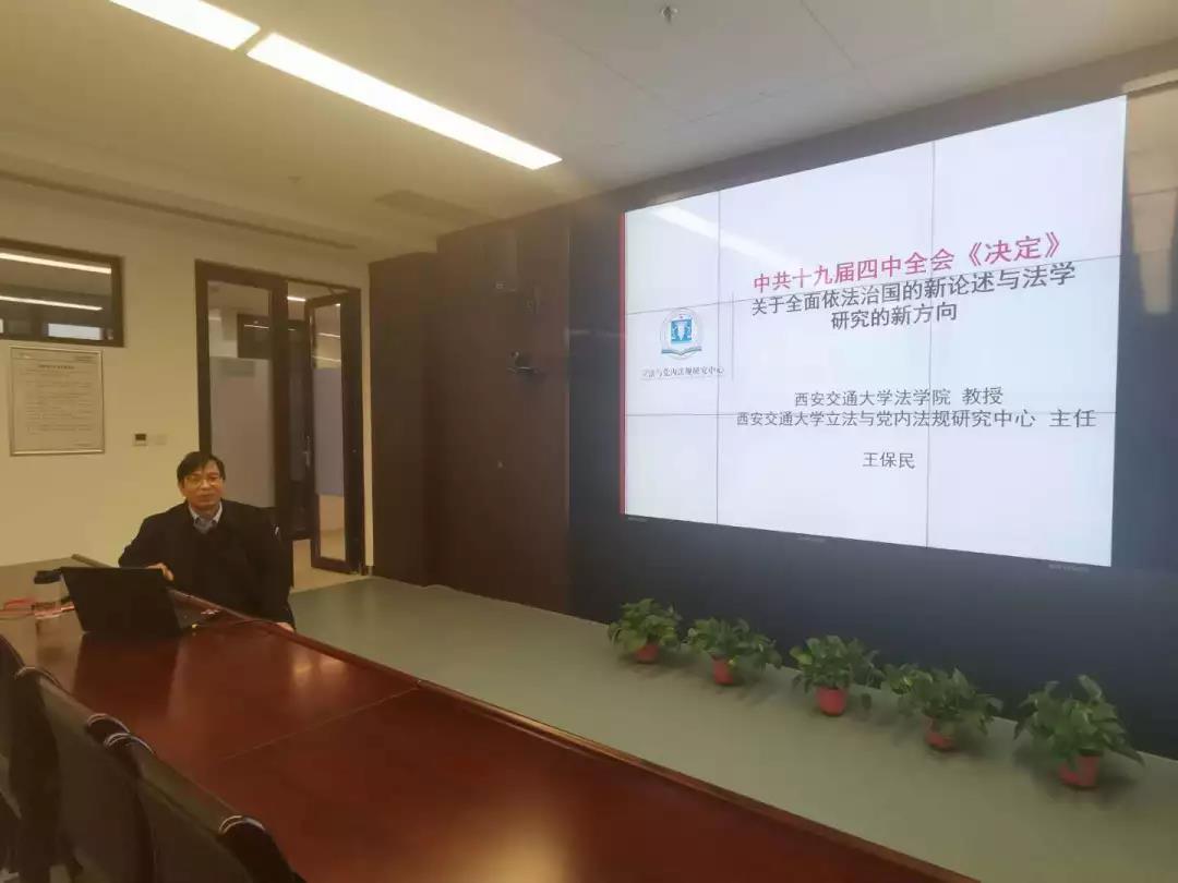 12月12日,k8体育·(sports)官方网站创新港系列学术讲座之“十九届四中全会关于全面依法治国的新论述与法学研究新方向”在创新港5号巨构10087教室顺利举行。k8体育·(sports)官方网站k8体育·(sports)官方网站党总支书记、k8体育·(sports)官方网站立法与党内法规研究中心主任王保民教授围绕中共十九届四中全会召开的基本情况和重要意义、《决定》中的高频词汇和理论亮点、《决定》关于全面依法治国的新论述、法学研究的新方向新热点等五个方面做了专题讲座。