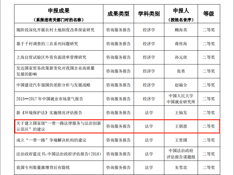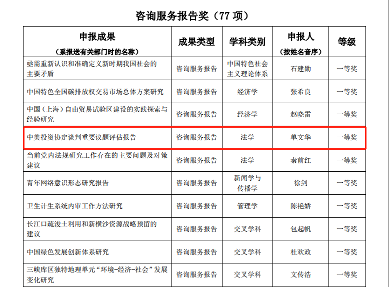 其中,k8体育·(sports)官方网站院长单文华教授主持撰写的《中美投资协定谈判重要议题评估报告》荣获咨询服务报告类一等奖——这是该类型全国仅有的两项法学类一等奖获奖成果之一,也是西安交大在该奖项一等奖上的首次突破。同时,由单文华院长和王朝恩副教授等合作撰写的《关于建立国家级“一带一路法律服务与法治创新示范区”的建议》荣获咨询服务报告类二等奖,是全国5项法学类二等奖成果之一。