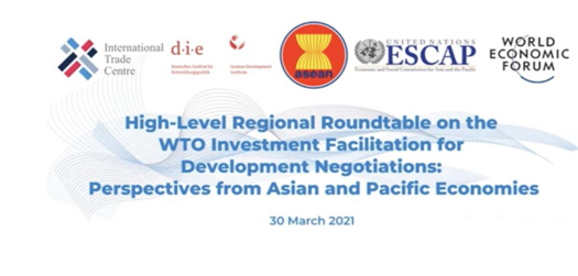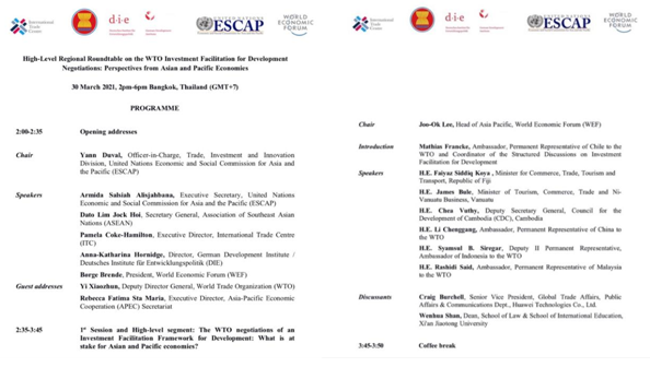2021年3月30日下午,“WTO投资便利化促进发展谈判区域高层圆桌会议:亚太经济体的视角”在泰国曼谷成功举行。k8体育·(sports)官方网站k8体育·(sports)官方网站院长单文华教授应邀参加并作“WTO投资便利化谈判所面临的挑战”的大会发言。此次会议由联合国亚洲及太平洋经济社会委员会(亚太经社会ESCAP)和世界经济论坛(WEF)、联合国国际贸易中心(ITC)、德国发展研究院(DIE)、东南亚国家联盟(东盟ASEAN)联合举办,参加会议的包括亚太地区各国商务部长、驻WTO大使、主要相关国际机构代表、投资促进和私营部门代表以及本领域的领军学者代表。会议的主旨是为争取WTO投资便利化谈判在年内取得重大进展加强共识。