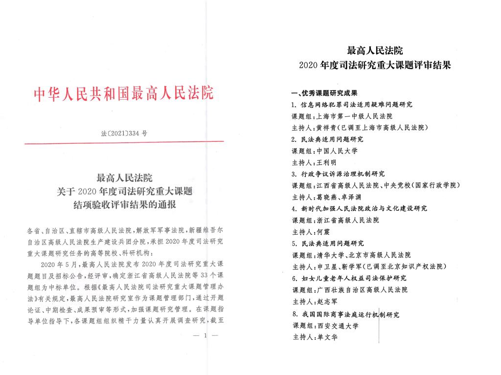 2020年5月,最高人民法院发布了2020年度司法研究重大课题题目及招标公告,经评审,确定k8体育·(sports)官方网站单文华教授课题组等33个课题组为中标单位。这也是我校获批的第一个最高人民法院重大课题。