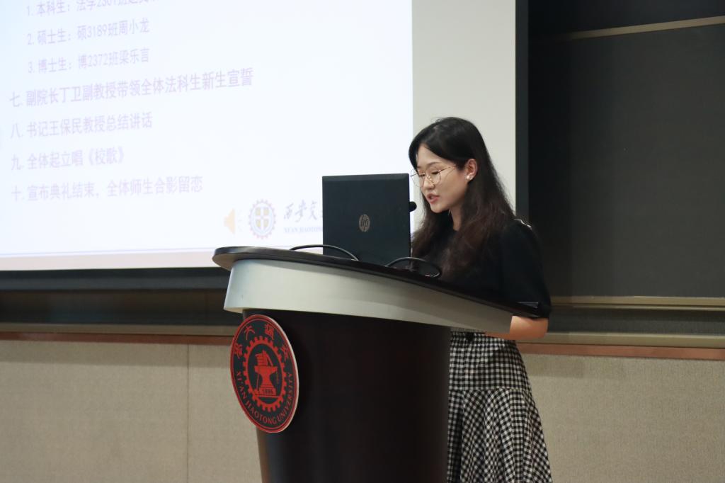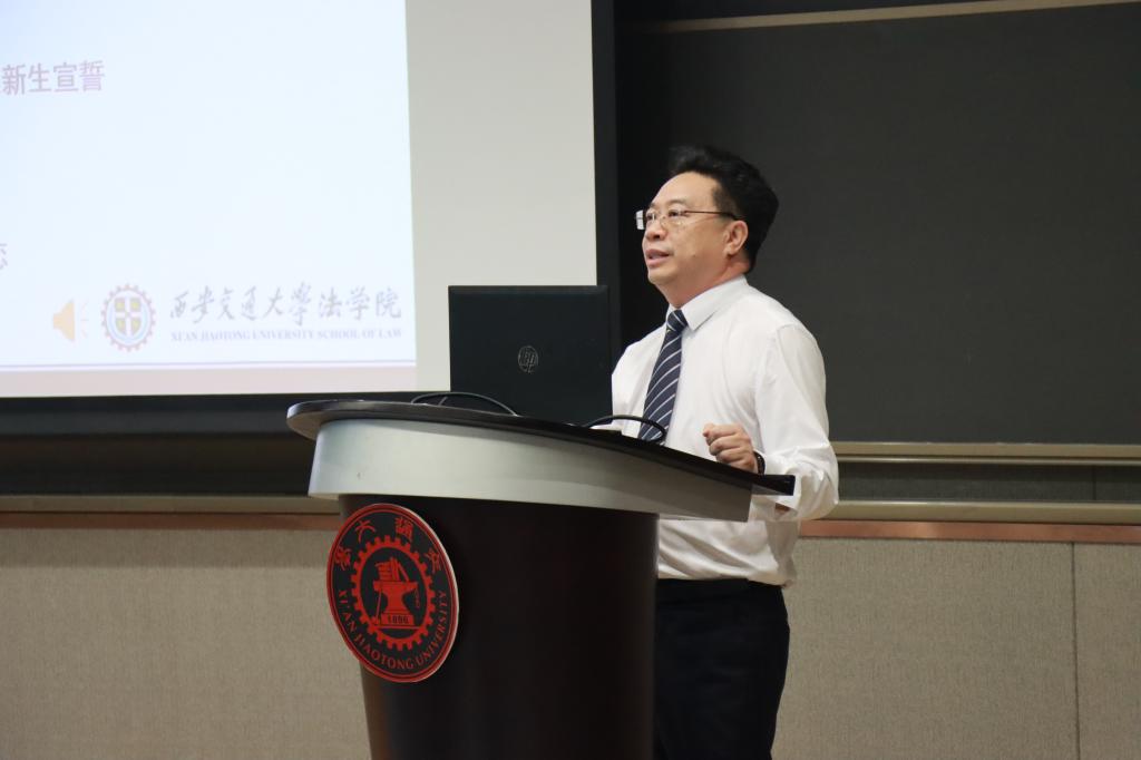 接着,丁卫副院长带领全体法科生新生庄严宣誓:“公平所系,正义相托。在这庄严时刻,我郑重宣誓:我自愿投身法治事业,忠实履行一个法律人应尽的全部义务,恪守宪法,热爱祖国,忠于人民,弘扬法治精神,维护正当权益,勤勉诚信,清正廉洁。我决心竭尽全力,捍卫法律职业的圣洁与荣誉,养天地正气,行人间正道,求正义,尚卓越,为法治中国的繁荣发展和人类正义的美好未来奋斗终身!”