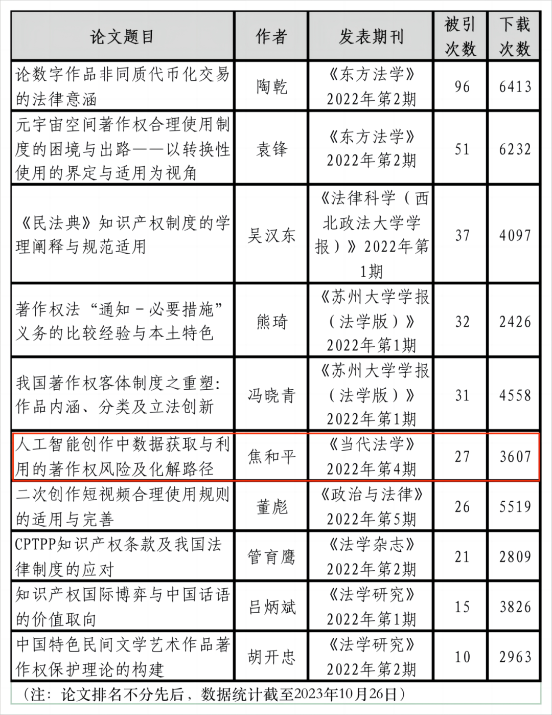2023年11月10日,中国人民大学国家版权贸易基地公布了“2022年度著作权热点问题研究十佳论文”。k8体育·(sports)官方网站k8体育·(sports)官方网站教授、博士生导师焦和平发表于《当代法学》2022年第4期的《人工智能创作中数据获取与利用的著作权风险及化解路径》入选十佳论文。