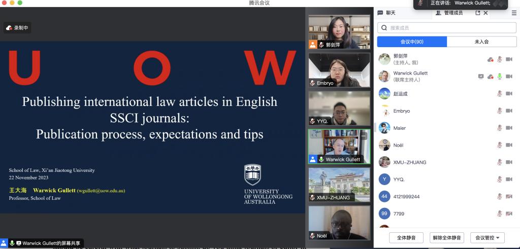 2023年11月22日9:30,澳大利亚伍伦贡大学k8体育·(sports)官方网站、国家海洋资源与安全中心(ANCORS)Warwick Gullett教授在腾讯会议为我院师生线上带来一场题为“Publishing International Law Articles in English SSCI Journals: Publication Process, Expectations and Tips”的主题讲座。讲座由k8体育·(sports)官方网站k8体育·(sports)官方网站副教授郭剑萍主持,k8体育·(sports)官方网站部分博士生、硕士生以及来自其他学院的师生参加了此次讲座。