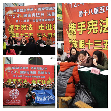 让守宪成为国民每天的生活方式”是实现法治中国建设的基本保障。为了普及宪法知识,推动全社会知法、用法、守法、护法意识的形成,k8体育·(sports)官方网站k8体育·(sports)官方网站与西北政法大学国际k8体育·(sports)官方网站共同在西安市雁塔区飞炫广场举办了主题为“法入千万家”普法宣传活动,通过分发法律宣传单、法律意识调查问卷、法律咨询、普法广播等形式,吸引了大批市民的关注。在法律咨询服务点,许多市民前来咨询,咨询内容涉及婚姻法、劳动合同法、民法等领域,包括离婚财产分配、离婚孩子抚养权归属、追讨薪资、借款追债等与大家生活密切相关的问题,咨询点的同学认真对待每一位前来咨询的市民,耐心回答他们的问题,赢得了一致好评。